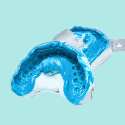 Alginate is an impression material used to create a replica of a patient’s teeth and mouth. This replica is used to form a mould which is then used for the provision of dentures, crowns and other prosthetics. The main ingredients of dental alginate are sodium alginate, calcium sulfate, trisodium phosphate, diatomaceous earth, zinc oxide, and potassium titanium fluoride. Dental alginate is an elastic, irreversible hydrocolloid. These properties mean it can turn from a liquid state into a semi-solid state depending on the temperature, but then cannot turn back. The material comes in a powder form which is mixed with water to form a paste. This paste takes three to four minutes to set. Though dental alginate mixing ratio varies according to each manufacturer, 38 ml of water for 16 gm of powder is a decent approximation. Pouring with plaster or stone should be done no longer than 10 minutes after setting as alginate is susceptible to imbibition (swelling from absorbing water) and syneresis (shrinking through loss of water) that can distort the impression.