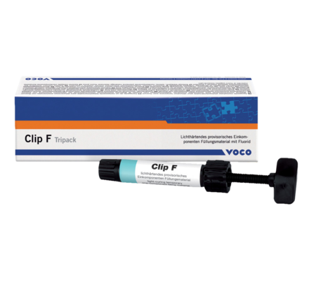 Fluoride-releasing Clip F fluorides are effective against secondary caries. Clip is simply polymerised by halogen light, is marginally tight and remains elastic, meaning it can be removed in one piece with a sharp instrument without damage to the preparation boundaries.