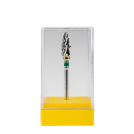 Tungsten carbide cutters for dental laboratories. Cross Cut fine are for precious metals and ceramics/porcelain; coarse are for Cr Cobalt, precious metals and acrylics; and x-coarse are for acrylics. Plain Cut are for precious metals and acrylics. Black - x-coarse for plastic and gypsum; green - coarse for shaping plastic and gypsum; blue - standard for all dental materials; red - fine for all dental materials; yellow - x-fine for alloys, composites and ceramics.