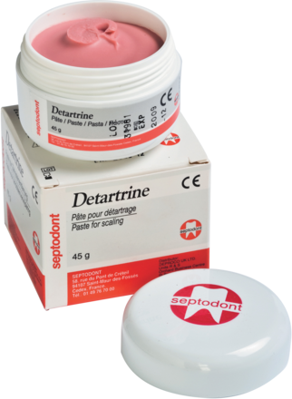 Dental paste for polishing fillings and dental surfaces, and polishing after scaling and root planing. Mechanical abrasive action due to the presence of silica. Pleasant taste and feeling of freshness due to essential oils. Detartrine Z contains zircon powder for the removal of stubborn stains caused by food, drink and tobacco.