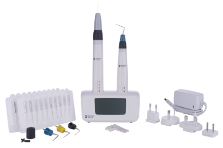 Cordless obturation device designed to work together with Conform Fit gutta percha master cones (ProTaper® GOLD, ProTaper Next®, ProTaper Universal, WaveOne® Gold, and TRUShape). Featuring low-temperature flow characteristics and radiopacity for a total warm vertical obturation solution. Master cones provide a snug apical fit for accurate tug-back, and the cordless handpieces provide precise control and excellent tactile feedback. Easy-to-use GP cartridges for use with obturation device and master cones, to fill canals conveniently and reliably, and provide easier access and visibility into the canal. Well-balanced, lightweight and comfortable. Single charge completes a days work. Heat Plugger and Thermal Response Tip to be used with Pack Handpiece to pack GP into the root canal. Kit includes Flow Handpiece, Pack Handpiece, Base Station, Gutta Percha Cartridges x 2, Electric Heat Plugger x 3, Heating Element, Bending Tool, Power Adaptor, Universal Plug x 4, and Cleaning Caps x 2.
