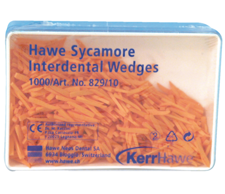 Colour coded interdental wedges with an anatomical optimal shape. The concave sides adapt perfectly to the interdental contour. The square end allows easy insertion of the wedge and the upturned tip prevents damage to the papillae. Wedges are made of splinter free sycamore wood, thus ensuring stability and compressibility.