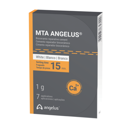 Reparative cement for treatment of root canal perforations or furcation, sealing of internal resorption and internal vessels, retro-obstruction in parendodontic surgeries, pulp capping (direct pulp protection and pulpotomy on permanent teeth and residues) in conservative treatments, apexification and apexogenesis, intracoronal sealing prior to the internal dental whitening of removed teeth, and sealed apical (plug) for root filling in canals with wide apical opening. Liberation of calcium ions induces bone remineralisation. Provides biological sealing holes and total peri-root injured tissue repair. Orthodontic material inducer of neoformation of peri-radicular cement. Hydrophilic. Antibacterial action. Low solubility does not allow marginal infiltration. Calcium oxide promotes tissue biocompatibility. High compression resistance. High radiopacity allowing excellent radiographic visualisation. Setting time of 15 minutes. Kit includes MTA 1g, Distilled Water 3ml, and Powder Dispenser.