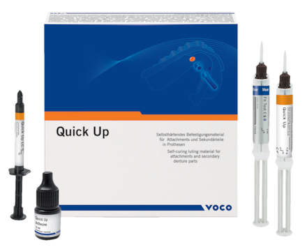Gingiva-coloured self-curing luting composite used for bonding attachments, such as ball locators and telescopic anchors, as well as other anchors in composite-based dentures. Can also be used for reattaching secondary elements in a denture, such as bar retainers. Direct pick-up results in more accuracy compared to indirect method. Low-heat, self-curing material avoids tissue irritation. High bond strength to acrylic denture base. Allows pick-up of any attachment. Kit includes QuickMix Syringe 7.5g, Quick Up LC Syringe 2g, Adhesive 4ml, QuickMix Syringe Fit Test C & B 5ml, and Accessories.