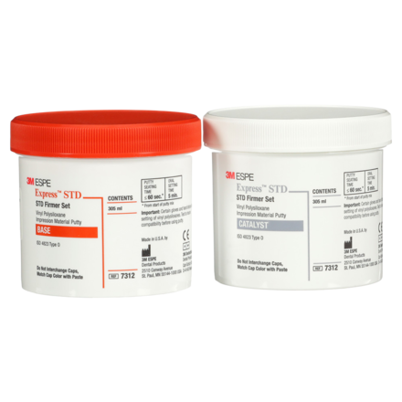 Handmix VPS impression material designed to help the user create accurate crown, bridge and denture impressions using 1-step or 2-step putty/wash techniques. Provides precise detail reproduction. Features a handmix putty and automix materials provided in easy-to-use cartridges. Multiple-pour capability. Good dimensional stability. Box includes 305ml Base and 305ml Catalyst.