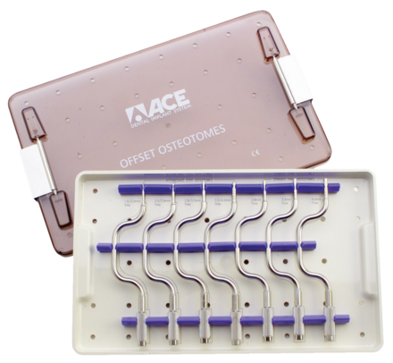Osteotome kit for use whilst undertaking bone grafting procedures.Kit contains Offset Osteotomes Stepped 1.6mm/2.0mm, 2.0mm/2.8mm, 2.8mm/3.3mm, 3.3mm/4.0mm, Final 2.8mm, 3.3mm and 4.0mm. Kit: Stepped - 1.6/2.0mm, 2.0/2.8mm, 2.8/3.3mm, 3.3/4.0mm, Final - 2.8mm, 3.3mm and 4.0mm