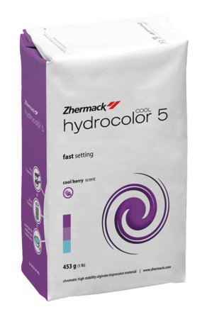 Chromatic high dimensional stability alginate. Indications include study models, paediatric impressions, removable and partial denture impressions and for temporary crown and bridges. Offers a visual guide for mixing, work and mouth times. Fuchsia phase: mixing time, Violet phase: working time, Light Blue phase: time in the mouth. Homogenous mix, smooth, compact surfaces. Long impression storage of 5 days. Water absorption in 5 seconds. Mixing time: 30 seconds, Working time: 1 minute 10 seconds, Time in mouth: 1 minute, Setting time: 2 minutes 10 seconds.