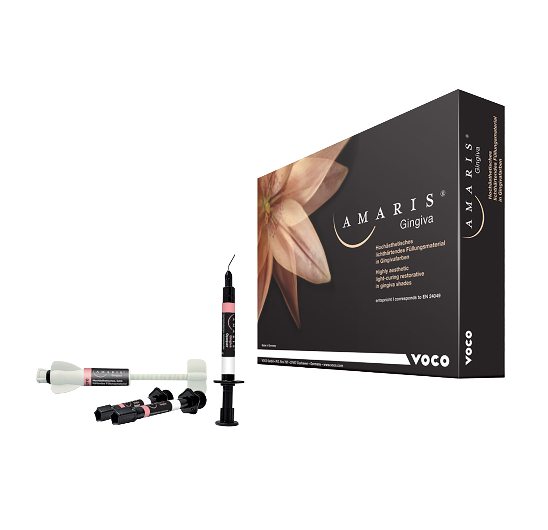 Highly aesthetic, light-curing anterior restorative in gingiva shades. Indications include the covering of exposed discoloured hypersensitive necks of teeth, especially in the visible anterior area. One base shade, combined with 3 mixable opaquers, can reproduce almost all gingival shades. Aesthetic and functional solution for cavities and v-shaped defects in cervical areas exposed by gingival recession. Intro Kit includes Base Shade Syringe 4g, White Syringe 1.2g, Light Syringe 1.2g, and Dark Syringe 1.2g.