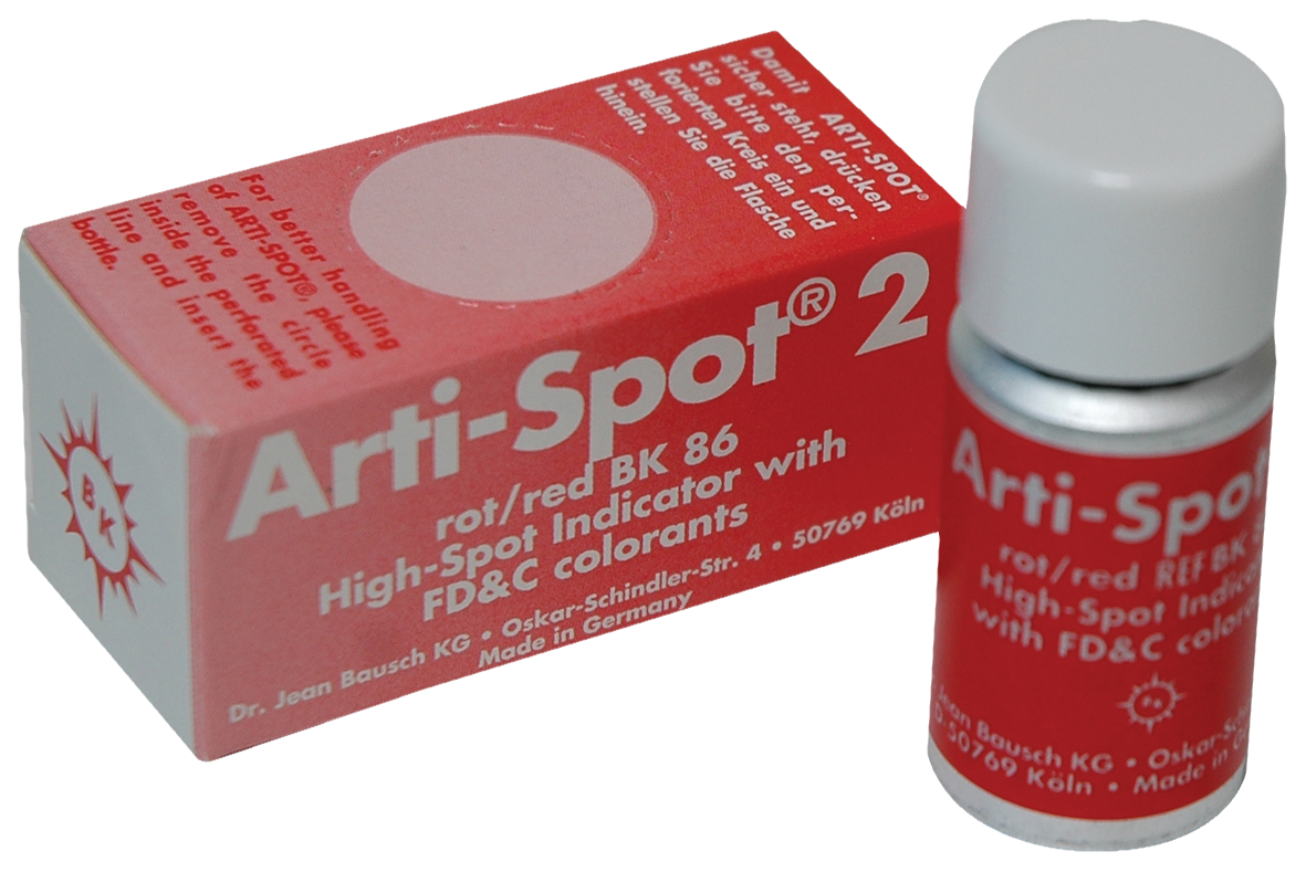 Contact colour for testing the accuracy of fit of crowns, inlays, onlays, telescoping crowns and clasps and the friction surface of debris. Applied to the test surface with a brush. Evaporates in seconds leaving a thin film, 3 microns thick. Arti-Spot can also be used to test for high spots on highly polished occlusal surfaces such as gold or ceramic.