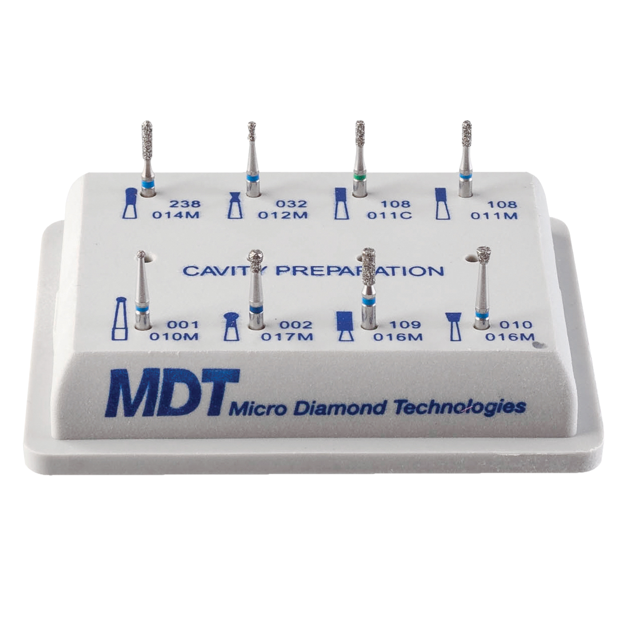 Cavity preparation kit, made up of 8 high quality diamond burs. Kit: 238-014M Pear, 032-012m Diabolo, 108-011M Flat End Cylinder, 108-011C Flat End Cylinder, 109-015M Flat End Cylinder, 001-010M Round, 002-017M Round with Collar and 010-017M Inverted Cone