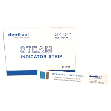 Indicator strips used to ensure that the correct sterilisation conditions have reached packaged instruments. Monitors one or more sterilisation processes for the purpose of detecting sterilisation failures in packaging, loading or steriliser function. Steam, rather than heat alone, is required to initiate colour change. Provides permanent record of compliance. Indicator turns from blue to black when exposed to sterilisation. 3.5 minutes at 134°C, 1.5 minutes at 121°C.