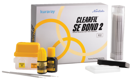 Two-step, self-etch, light-cure bonding agent with an improved catalyst system for stronger bonds and an innovative dual-cure activator. Indications include: direct restorations using light-cured composite, cavity sealing for indirect restorations, treatment of exposed root surfaces and hypersensitive teeth, repairs of fractured restorations, post cementation using a dual or self-cure composite resin, core build-ups, cementation of inlays, onlays, crowns, bridges and veneers using a composite resin cement. Kit: Primer 6ml x 1, Bond 5ml x 1, Dispensing Dish x 1, Light-blocking Plate x 1, Outer Case x 1 and Applicator Brush Fine x 50.