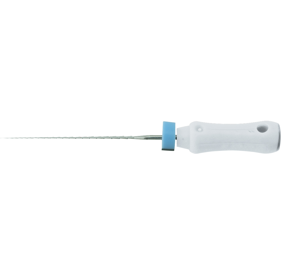 Flexible, stainless steel hand reamers. Instrument type and ISO number are clearly marked on the handle. Complete with endo stop.
