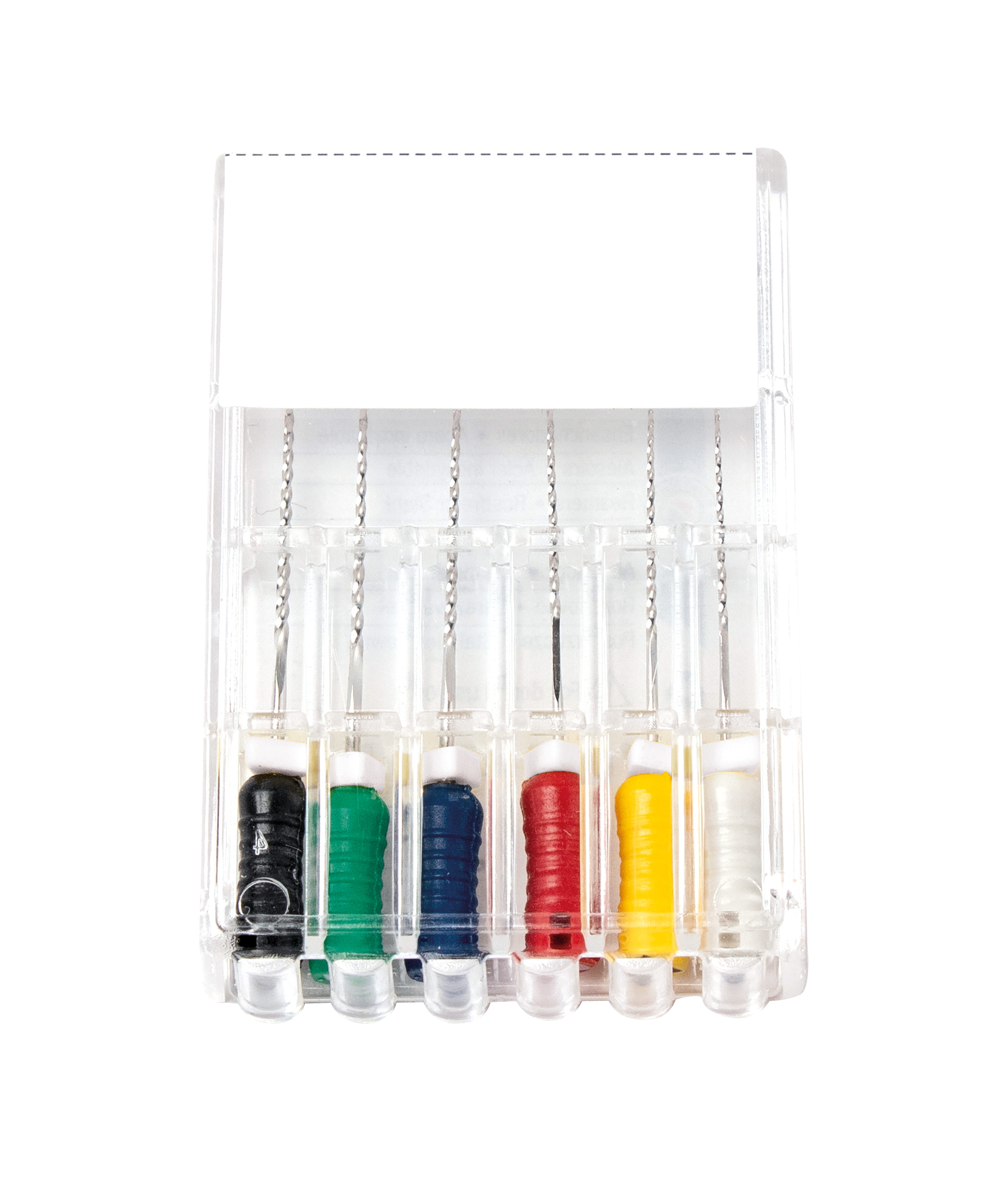 Flexible stainless steel hand reamers with endo stop. Instrument type and ISO number are clearly marked on the handle.