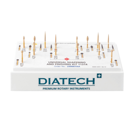 Finishing kit for contouring and finishing of amalgam, composite, compomer, porcelain, glass ionomer and gold restorations. Highly efficient diamond burs which will not harm the surface of the restoration nor the adjacent tooth structure. Kit includes Multilayer FG Contouring Diamond Burs x 8 and Multilayer FG Finishing Diamond Burs x 6.