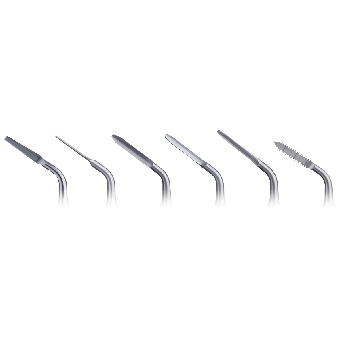 LC tips for extraction and immediate placement. The tips are intented for clinical acts such as extraction of wisdom teeth, fractured roots, impacted teeth and root section. Micro-ultrasonic osscillations cause detachment of the ligament without damaging the surrounding soft tissue.