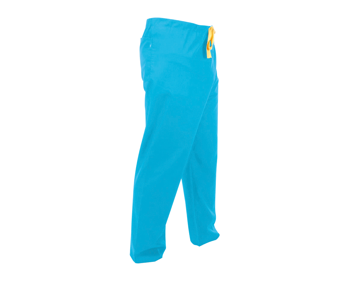 Basic, fully reversible unisex drawstring trousers with back pocket. Lightweight fabric with coloured tie for size identification.
