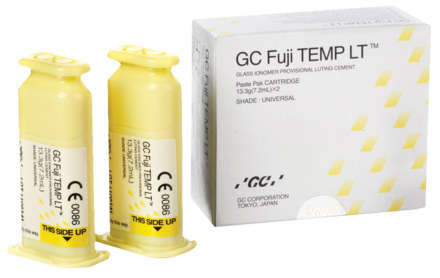 Paste-paste glass ionomer provisional luting cement, designed for long tem cementation. Indications include long-term temporary cementation of all types of all-ceramic, resin, acrylic and metal-based crowns and bridges, including try-on cementation of long-span prosthetic appliances. Especially adapted to assure sufficient retention and retrievability of crowns and bridges cemented on implant abutments. Pleasant handling; no runny consistency with low film thickness and easy to remove excess. Reliable retention; long term security with no negative influence on final adhesive cementation. Secure retrievability; safe removal of the restoration whenever needed with easy clean up.