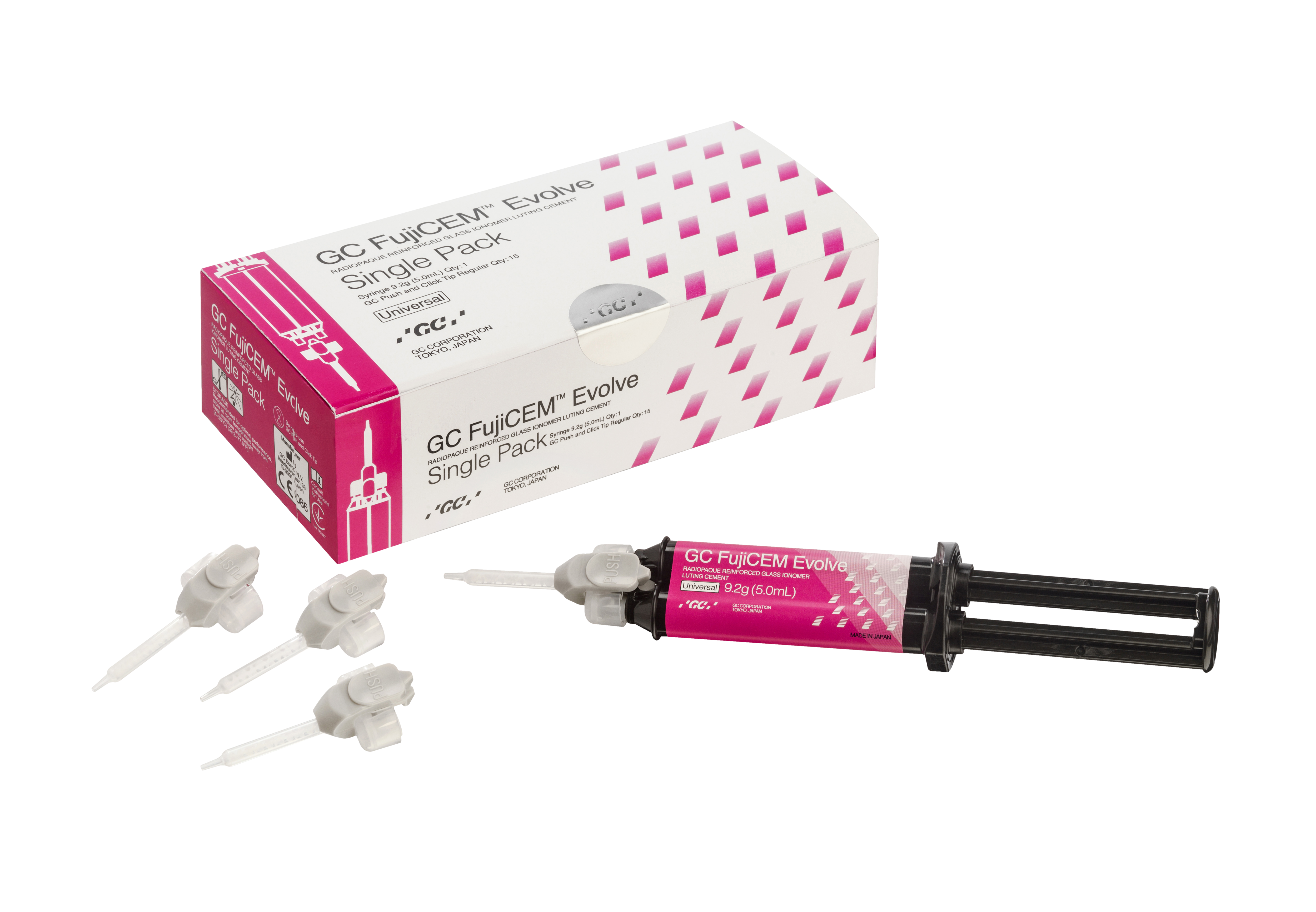 Paste-paste resin-modified glass ionomer luting cement indicated for metal and porcelain fused to metal (PFM) crowns and bridges; composite inlays, onlays, crowns and bridges; high-strength all-ceramic (zirconia) crowns and bridges; and all ceramic inlays, metal, ceramic and fibre posts. Low post-operative sensitivity. Moisture tolerant (no need for rubber dam) and technique tolerant without pre-treatment. Good working time and fast setting time. Ergonomic lightweight syringe fits all hands. Push and Click tips lock in one touch. Ideal consistency for easy extrusion with one hand, low film thickness (12µm), and perfect adaptation. Tack-cure option for easier excess removal. Brighter and less chromatic shade for universal clinical uses. Super-long-chain hydrophilic cross-linking monomers, bringing strength and stability. Includes; Syringe 9.2g and Push and Click Tips x 15