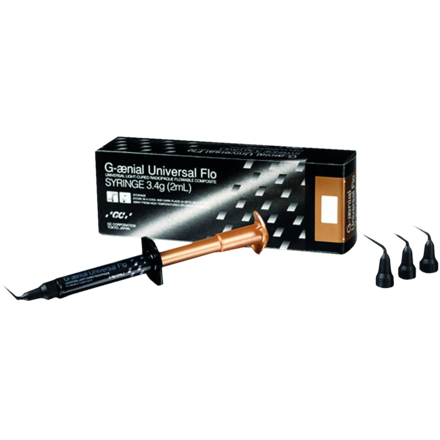 Flowable composite with all the necessary features to give optimal clinical results. Indications include all Class I, II, III IV and V, minimum intervention cavities and fixation of mobile teeth. Material boasts a flowing viscosity, for easy and convenient placement. Fast and easy polishability. Ergonomic syringe with special coated tips for easy application and with minimal residual paste.