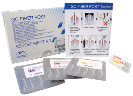 Glass fibre reinforced composite post. Available in a range of sizes for minimal canal preparation. The modulus of elasticity of the posts allows for better stress distribution, therefore minimises the risk of root fracture. The posts offer a high density of glass fibres (77% in weight) with no structural defects, ensuring a high resistance to load. Works perfectly with Gradia Core material. Assortment Kit: Post 1.0mm x 5, Post 1.2mm x 5, Post 1.4mm x 5, Drill 1.2mm and Drill 1.4mm
