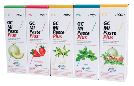 Water-based, sugar-free topical paste containing bioavailable calcium, phosphate and fluoride. Patented form of fluoride: 900ppm. Designed for patients that have a high risk of caries. Promo Pack includes Tubes 40g x 5 (Melon, Strawberry, Tutti-Frutti, Mint and Vanilla).