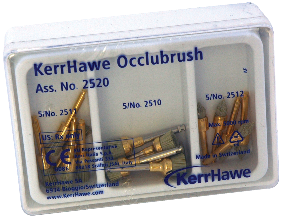 Silicium carbide particles impregnated brushes for pre- and high-gloss polishing of occlusal restorations. One-step polishing brush system.