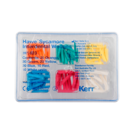 Colour coded interdental wedges with an anatomical optimal shape. The concave sides adapt perfectly to the interdental contour. The square end allows easy insertion of the wedge and the upturned tip prevents damage to the papillae. Wedges are made of splinter free sycamore wood, thus ensuring stability and compressibility.