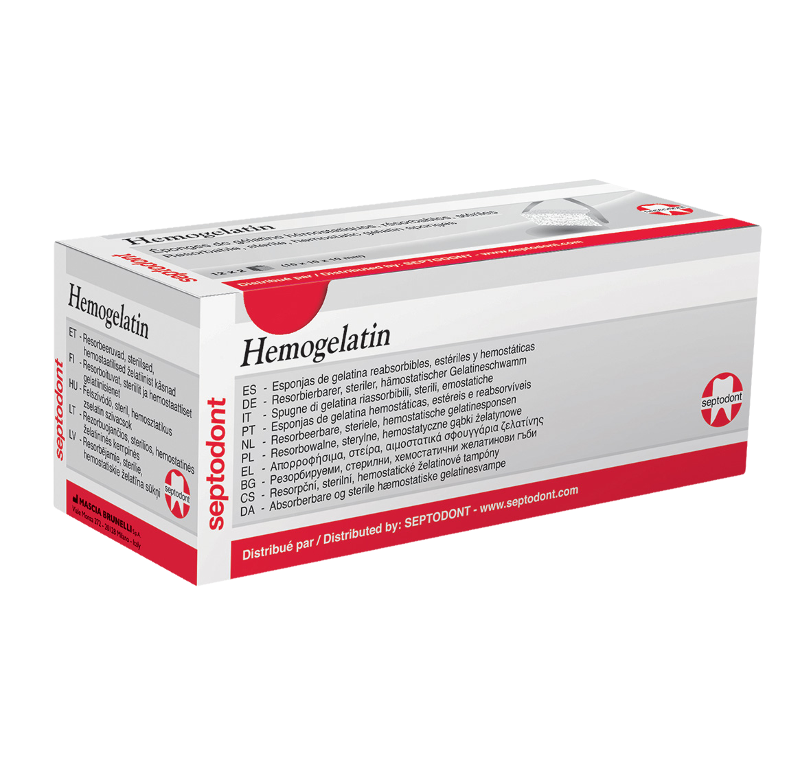 Resorbable, sterile, haemostatic gelatin sponges. Can be used dry or soaked with sterile saline solution through simple application, or by exerting slight pressure like a haemostatic device for controlling bleeding on extraction sites, periodontal surgical wounds, suture sites, oral ulcers (non-infected or viral), traumatic wounds, and denture sores. Gelatin: good haemostatic activity (absorption rate: 35) and efficient in bleeding management. Flexible cube shape (10 x 10 x 10cm) is convenient to use and cut, easy to place and fits all clinical situations.