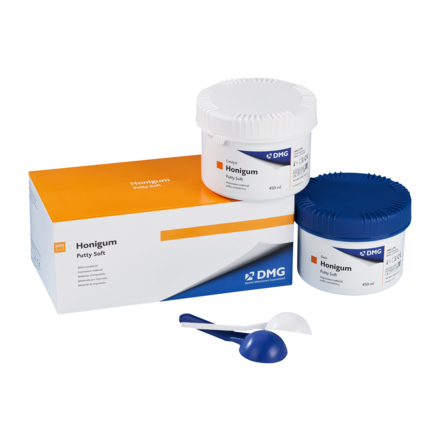 VPS silicone-based impression material with a putty-like consistency to be mixed by hand. User-friendly consistency, pleasant honey scent, excellent dimensional stability. Snap-set technology gives the user ample working time with a very quick hardening. Honigum Putty Soft - Shore hardness 62 for a softer final hardness, suited for one-step impressions with Honigum Light. Mixing time: 30 seconds. Working time including mixing: 3 minutes 15 seconds. Colour: turquoise. Pack includes 450ml Base and 450ml Catalyst.
