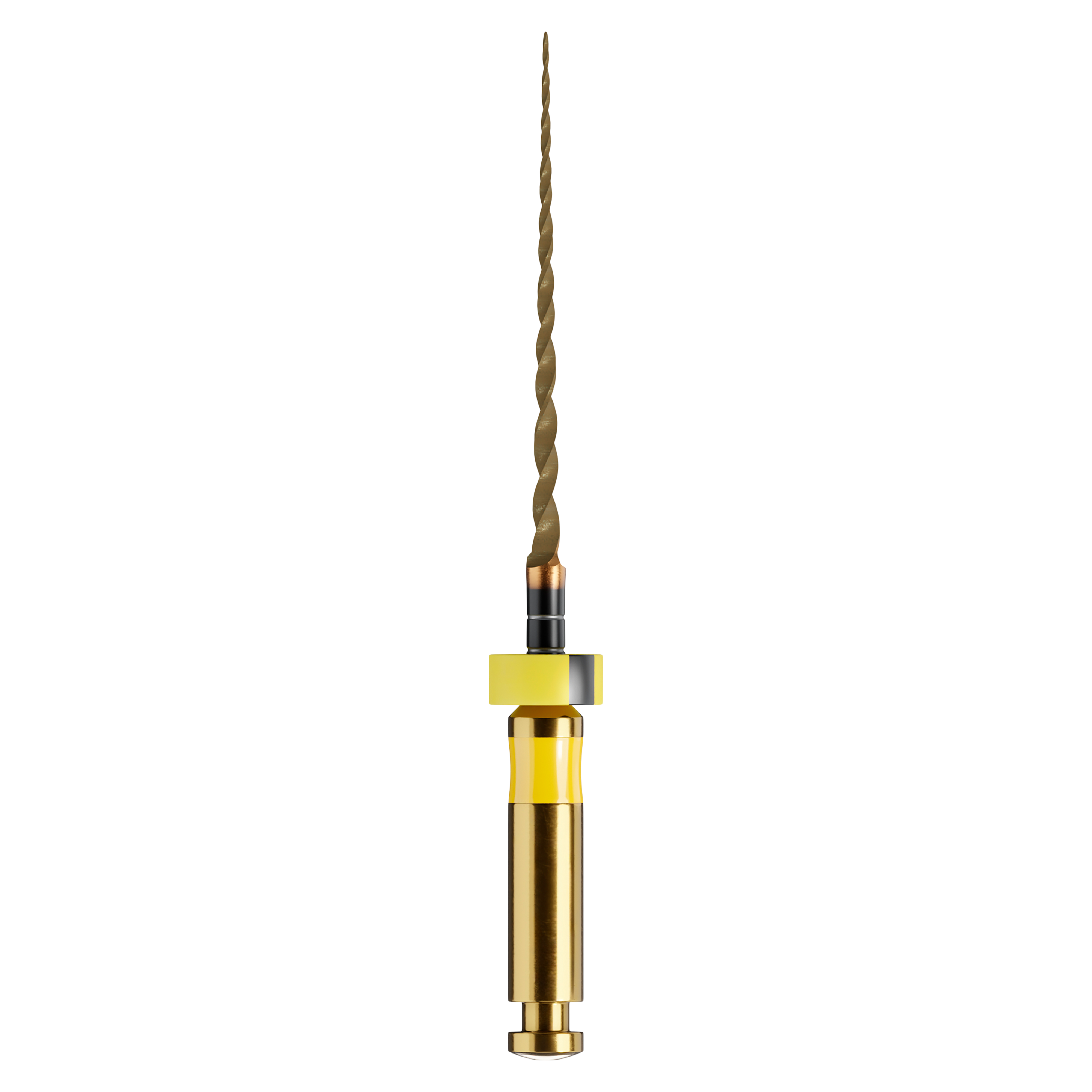 Nickel titanium file with increased flexibility. Controlled memory allowing files to be bent before use, returning to its original shape with the stability of a new file following instrument sterilisation.