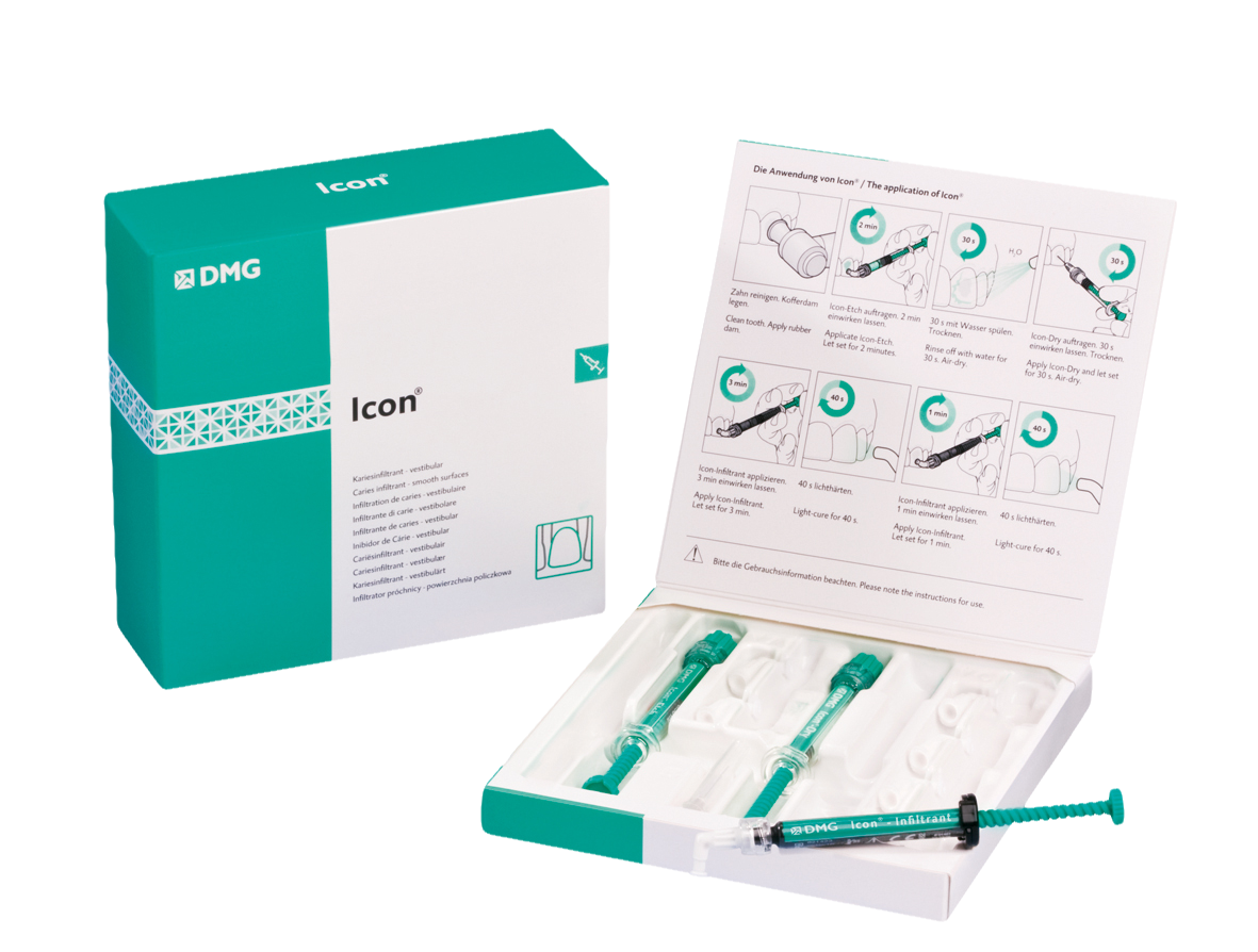 Caries infiltration material to counteract initial indications of early enamel lesions (caries) and white spot caries-like lesions. Treated lesions lose whitish appearance and look like healthy enamel. The high fluid resin infiltrates and penetrates into the enamel caries and blocks the path to acids. Healthy hard tissue is preserved. Can be used in difficult to reach areas and on smooth surfaces. Kit Contents: 7 Treatment units each including: 0.3ml Icon-Etch Syringe, 0.45ml Icon-Dry Syringe, 0.45ml Icon-Infiltrant Syringe, 6 x Approximal Tips, 1 x Luer-Lock Tip, 4 x Dental Wedges.