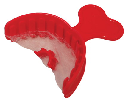 Adhesive-free, dual-arch impression tray designed with thin transparent webbing to allow the capture of occlusal details during impressioning. The webbing also offers firm support of impression material before and after curing/setting. The combine dual-arch tray and impression material captures the three-dimensional shape of the teeth and oral tissue in the maxillary, mandibular arches and the bite registration.