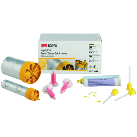 Superfast-setting A-silicone with active self-warming. Short intraoral setting time (from 75 seconds). Chemical reaction causes material to actively and quickly warm up to body temperature after working time, substantially accelerating the intraoral setting without affecting the working time. Extremely hydrophilic for excellent flow and fine detail reproduction. Pleasant mint flavour. Trial Kit includes Base Paste 300ml, Catalyst 60ml, Imprint 4 Super Quick Light Cartridge 50ml, Penta Mixing Tips Red x 10, Garant Mixing Tips Yellow x 5, and Garant Intraoral Tips Yellow x 5.