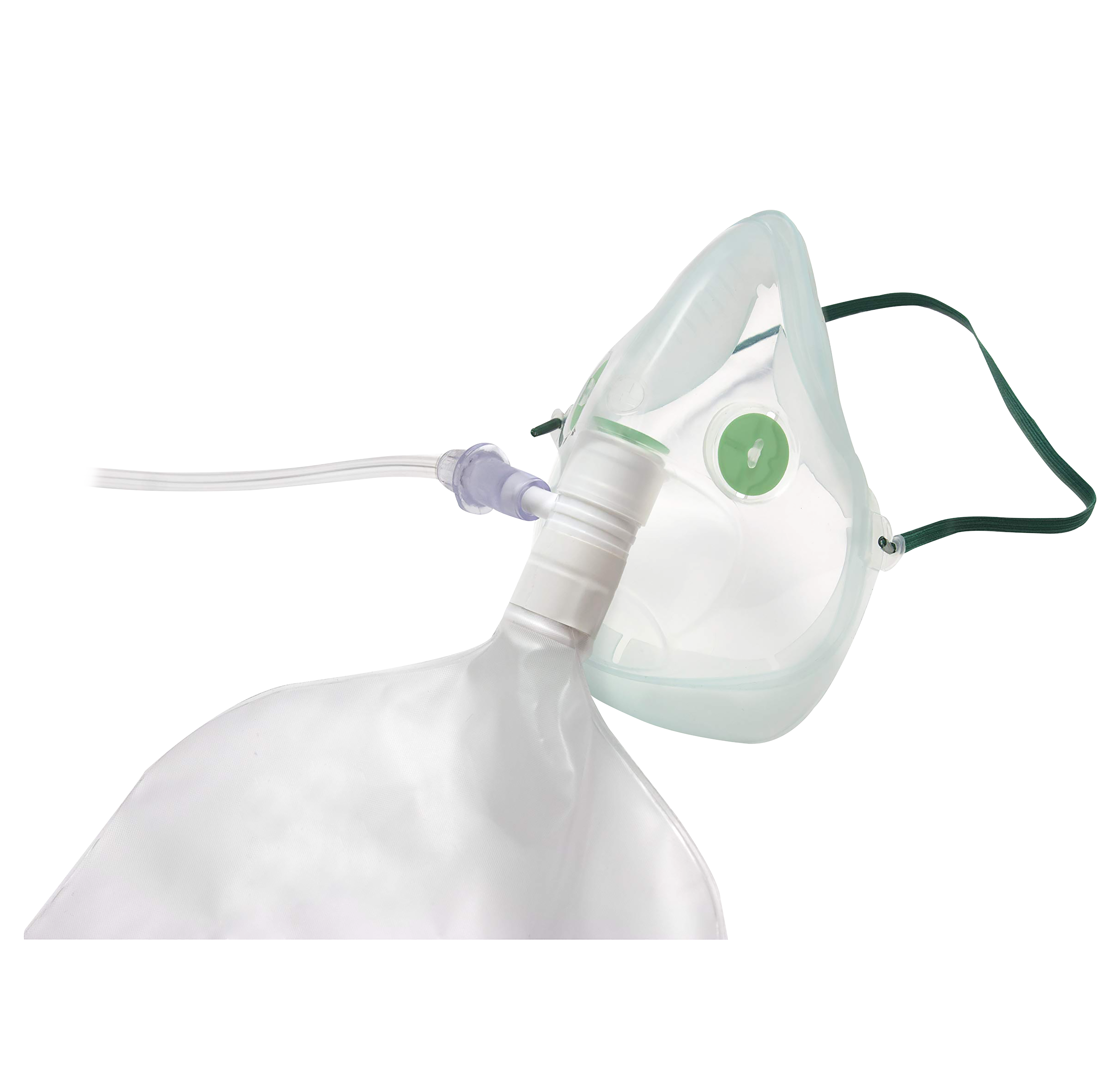High-concentration masks, also known as partial and non-rebreathing masks. Can provide concentrations of oxygen up to 80% at flows of 10-15L/m (values are approximate and depend on the patient's breathing pattern). Latex-free. Supplied individually. Includes reservoir bag.