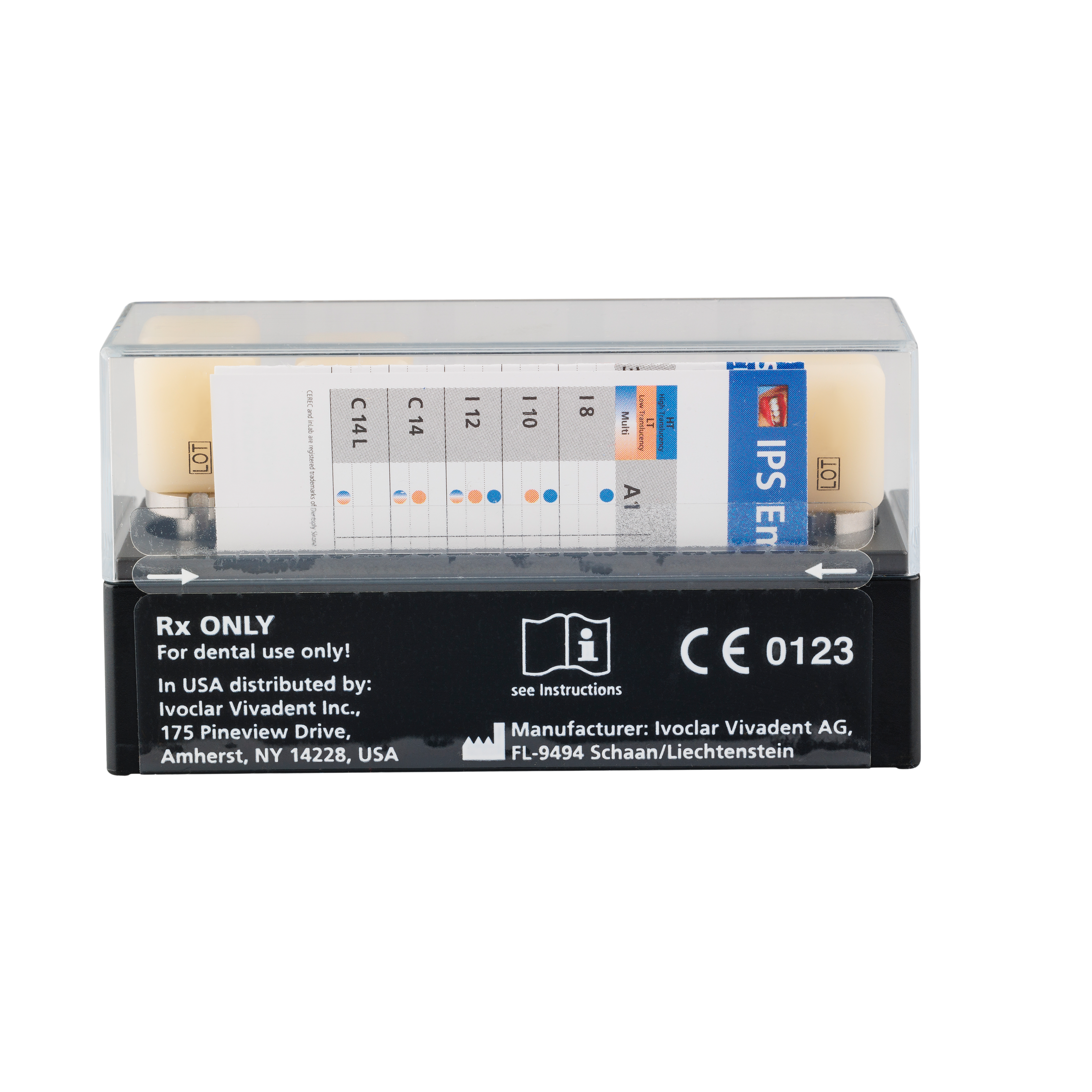 Blocks suitable for the chairside fabrication of all ceramic inlays, onlays, veneers and crowns by means of CAD/CAM. Excellent light-optical properties and an outstanding mean biaxial flexural strength. Exceptional aesthetics and can be easily polished to a high-gloss finish. Can be stained or glazed using the universal staining and glazing assortment of IPS e.max Crystall, Shades, Stains and Glaze. The wide range of translucency levels, shades and block sizes offers great flexibility.