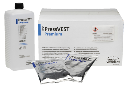 Phosphate-bonded investment matrial for the conventional heating method. Cannot be used for metal casting or IPS Empress layering technique due to high temperature. Produces pressings with accuracy. Can be used with IPS InLine PoM (Press-on-Metal Ceramic), IPS e.max Press and ZirPress as well as IPS Empress Esthetic and Cosmo pressed in furnaces.