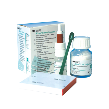 Radiopaque glass ionomer luting cement and cavity liner. For permanent cementation of inlays, onlays, crowns and bridges made of metal or porcelain-fused to metal and all-aluminia or all-zirconia strengthened core ceramic systems (e.g. Lava Crowns & Bridges). Also for permanent cementation of endodontic posts and orthodontic appliances made of metal cavity lining. Intro Pack includes Powder 33g, Liquid 12ml and Mixing Pad.
