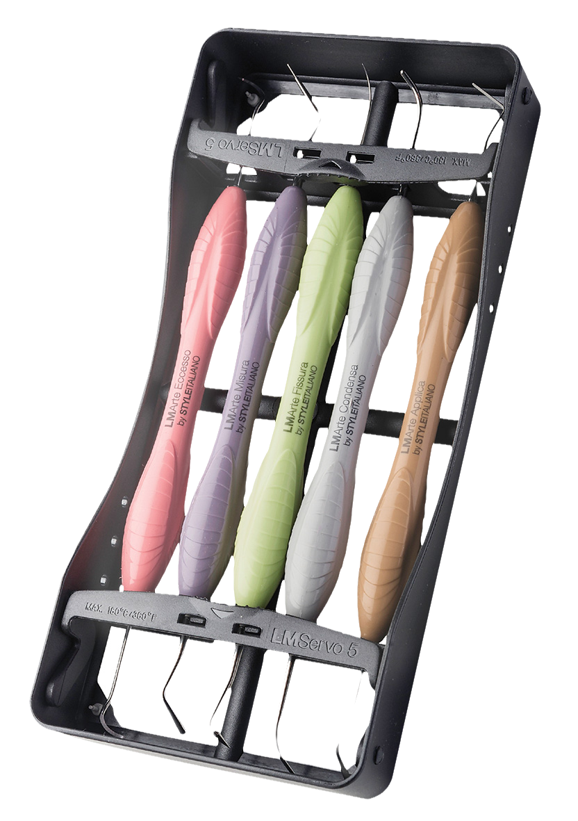 Innovative instruments for aesthetic restorations that have been specially designed for composite layering. Developed in cooperation with Style Italiano - a study group of clinicians and researchers specialising in aesthetic restorative dentistry. Ergonomic handles reduce the risk of repetitive strain injury. Medical-grade silicone ensures superior grip even with a wet glove. Specialist instruments ensure a perfect match for your needs. LM Arte Kit with ErgoMax Handle includes LM Arte Applica, LM Arte Condensa, LM Arte Fissura, LM Arte Misura and LM Arte Eccesso in LM-Servo 5 Cassette.