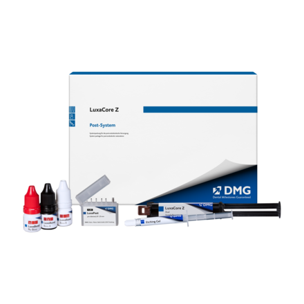 Complete system for post-endodontic restorations, combining LuxaCore Z, LuxaPost and LuxaBond. With the premium composite LuxaCoreZ-Dual, this system now offers the logical further development of the successful material as an ideal partner for LuxaPost, the quality glass fibre reinforced composite post, and the adhesive system LuxaBond-Total. Combing these specialty products, makes up a carefully coordinated system for professional post-endodontic restorations. Homogenous monoblock. Reliable bond LuxaCore Z as core build-up material. LuxaPost as pre-silanized post. LuxaCore Z as post cement. LuxaBond as dual curing bond. Luxacore Z-Post System Kit includes LuxaCore Z-Dual Smartmix A3 Syringe 9g, Smartmix Tips x 10, Endo Tips x 10, LuxaPost 1.25mm x 5, LuxaPost Drill 1.25mm, Silicone Stops x 10, Measuring Card, LuxaBond 5ml x 3, Etching Gel Syringe 2ml, Endobrushes x 50, Luer Lock Tips x 3, Mixing Pad and Educational CD.