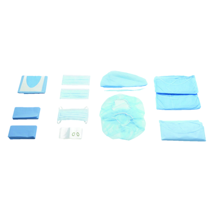 Sterile kit containing all the essentials for use before the start of every procedure. Specially designed for implant surgery. Includes Water-Repellent Gown with Cotton Cuffs, Water-Repellent Gown with Elastic Cuffs x 2, Surgical Cap with Ties, Round Cap with Elastic, Monoart Facemask PTC 3 with Ties x 2, Monoart Facemask PTC 3 x 2, Drape with U-Shaped Cut with Adhesive 75 x 90cm, Rectangular Drape 50 x 75cm x 2, and Tubing Sleeve with Elastics 120 x 7cm.