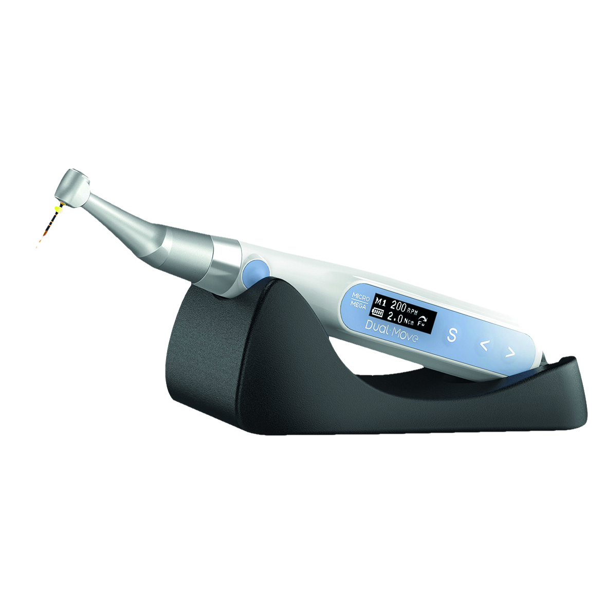 Cordless endodontic motor with well-balanced, in-hand, silent endodontic motor for control of movement, speed and torque, offering freedom, comfort, and optimal security when shaping the root canals. Display turns around in order to suit to left-handers, and contra-angle rotates without being disconnected from the handpiece. Miniature head and thin neck make it easier to reach the posterior teeth while keeping excellent visibility on the root canals inlets and working area. Portable motor for perfect adaption to individual needs and practices. Prevention of file separation, control of speed and torque, and correction of possible gradual drifts through auto-calibration, for safe endodontic treatment. High levels of customisation and functionality, with advanced features available when combined with the Dual Pex apex locator.
