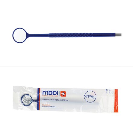 Sterile single-use front face mirror which features an ergonomic, ABS plastic handle (latex-free) with ridges and grooves to maximise user comfort and reduce hand fatigue. Dual functionality with a stainless steel tip for percussion testing and an anti-fog mirror surface. Individually packed, sterile (ethylene oxide) with a shelf life of 5 years from date of manufacture. CE and TGA registered with removable GS1 tracking label.