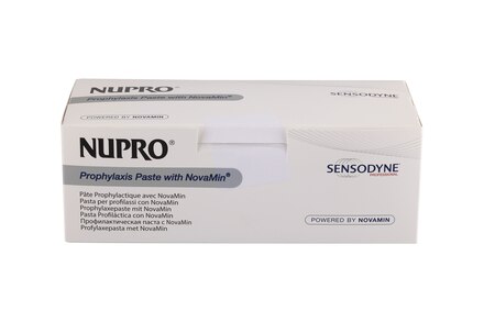 Prophy paste providing immediate sensitivity relief while delivering excellent polishing and stain removal properties. Powered by NovaMin®, a bioavailable calcium phosphosilicate, NUPRO SENSODYNE prophy paste delivers tooth desensitisation, tubule occlusion and stain removal in one easy-to-use paste. Paste can also be applied before or after scaling and root planing. Fluoride-free. Fine/medium grit for the removal of light stains.