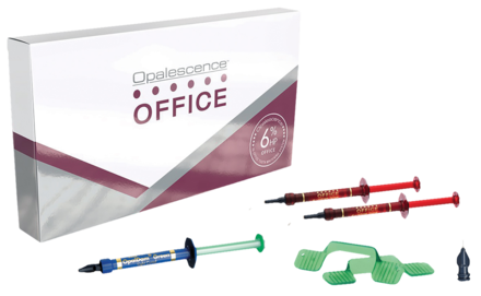 Cosmetic tooth whitening system with 6% hydrogen peroxide for first contact, chairside whitening treatment. Fresh, easy mixing gel for each application. Chemically activated, no light needed. PF formula strengthens enamel, decreases sensitivity and prevents caries. Bright colour for better placement and complete removal. Store refrigerated. Patient Kit includes Syringe 1.2ml x 2, OpalDam Green Syringe 1.2ml, IsoBlock, Shade Guide Card, Microtips 20G x 5 and Microtips FX 20G x 5.