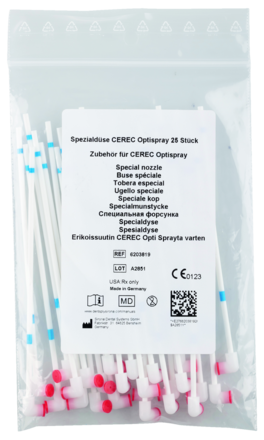 An advanced contrast medium to enable easier and more precise optical impressions, and ultimately, the most aesthetic and functional CAD/CAM-produced dental restorations possible. Fast, effective and simple application. The layer is removed within seconds with water or solution. Thanks to a thin homogeneous contrast layer, optimal optical results are achieved. Depending upon application (mandible/maxilla), the spray head can be easily turned or angled into the desired position. Blue in colour, making it more easily distinguishable than white. Spearmint scent and flavour.
