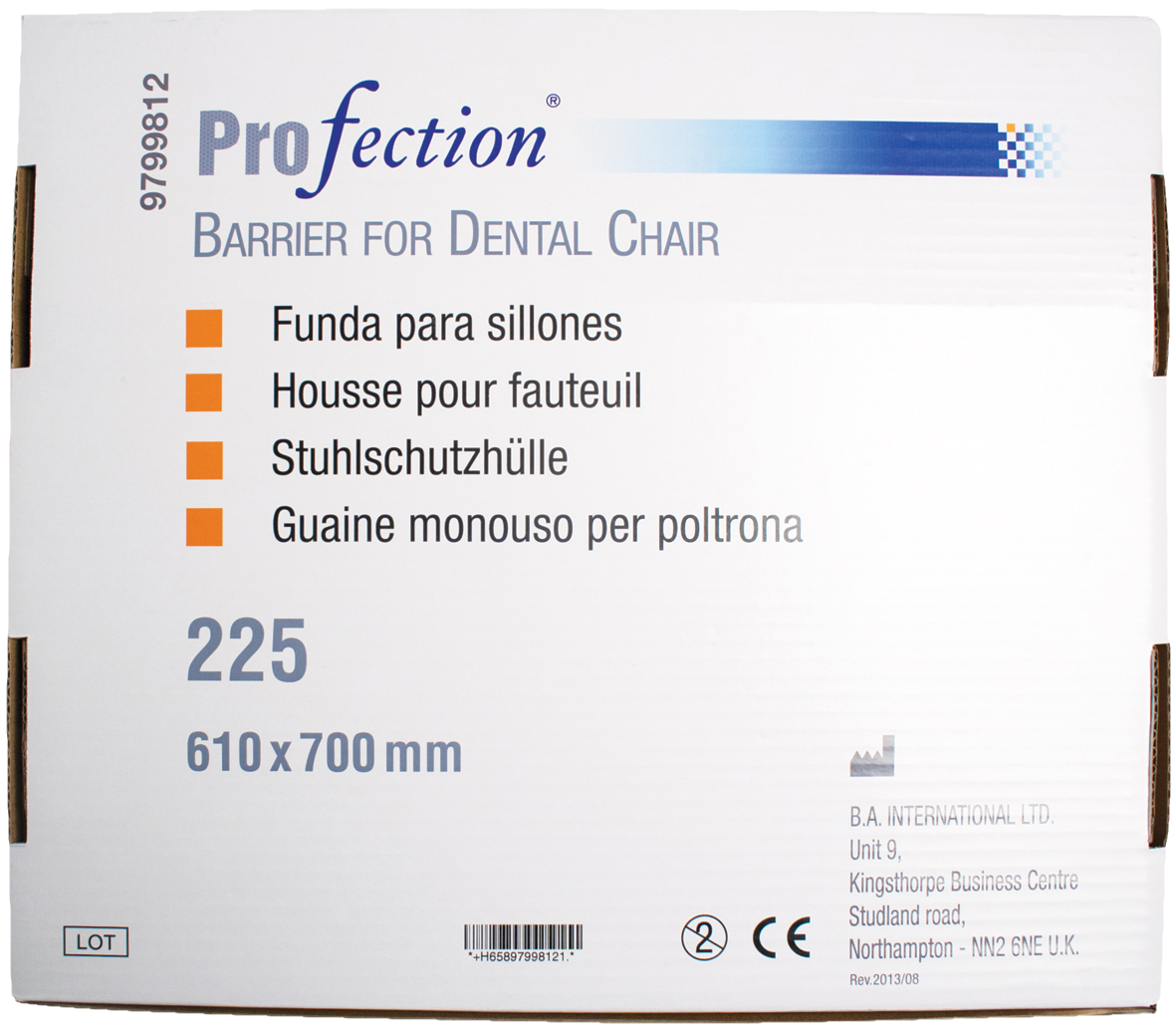 Single use polypropylene barrier in dispenser box for dental chair, fits most units.