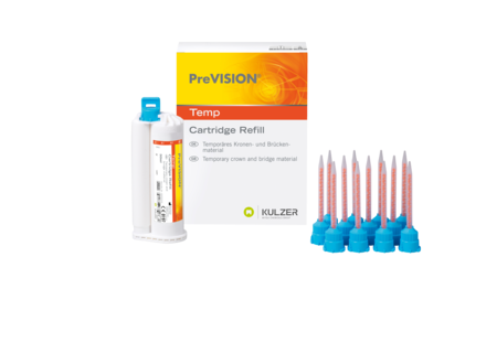 Self-curing, two-component temporary crown and bridge material for solid and fracture-proof temporary restorations. Durable and fracture resistant until the permanent restoration is placed. Wide colour range and excellent polishability. Practical 10:1 automix cartridge for fast and easy application. Fluoride releasing.