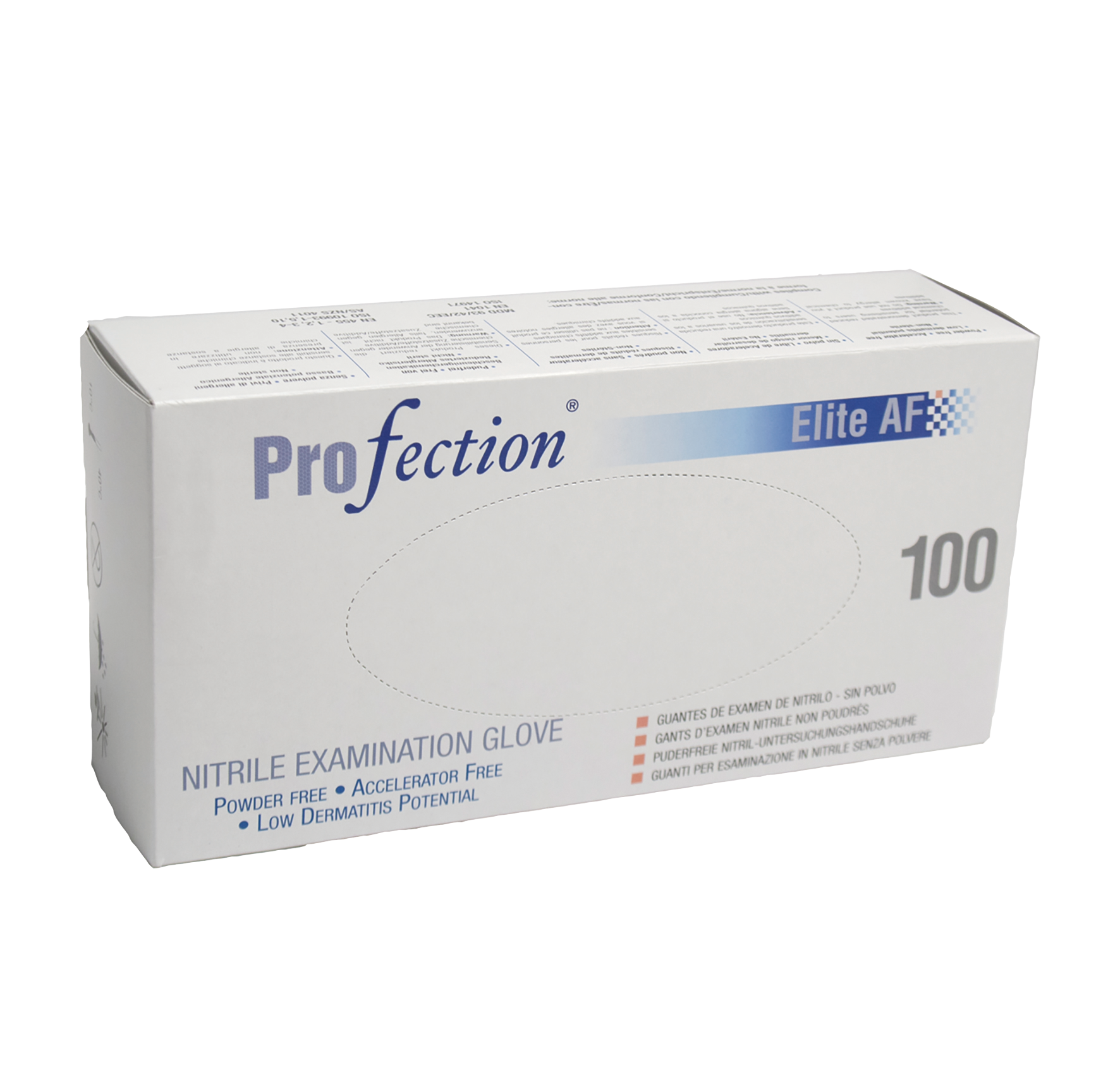 Accelerator free nitrile gloves. In addition to being latex free, Profection further reduces the potential for allergy as they are free from common accelerators that are linked to Type IV (non latex) allergies, and are also produced without the use of sulphates. Better tear and puncture resistance than latex gloves. The gloves have a rolled cuff, and a minimum length of 240mm for protection. Textured finger tips for improved grip. Available in 5 sizes. Colour - Blue. Complies to EN 455 1,2,3,4 and EN374 1,2, EN 420.