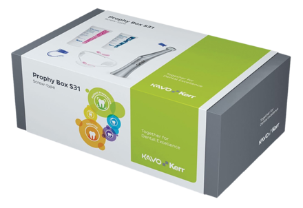 Prophy box that combines SMARTmatic contra-angle handpiece with Kerr prophylaxis essentials. Kit S31 includes SMARTmatic S31 Handpiece, Prophy Cups Screw Type x 30, Cleanic Tube Fluoride 100g x 2 (Mint, Berry Burst), OptiView Standard Kit, and Prophy Clips x 12.